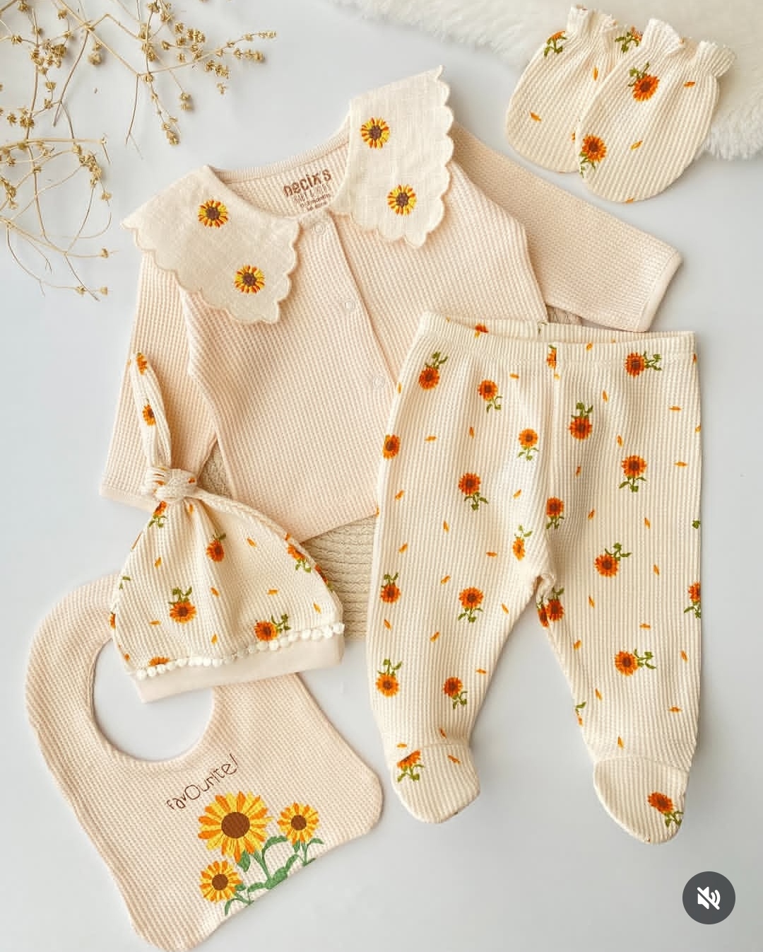 ست نوزادی پنج تیکه دخترانه شیک و خوشگل شا مل بلوز شلوار و کلاه و دستکش و پیشبند صدرصد پنبه بیسکویتی پنبه تمام فصل وارداتی 🇹🇷 تک رنگ و تک سایز صفر تا سه ماه