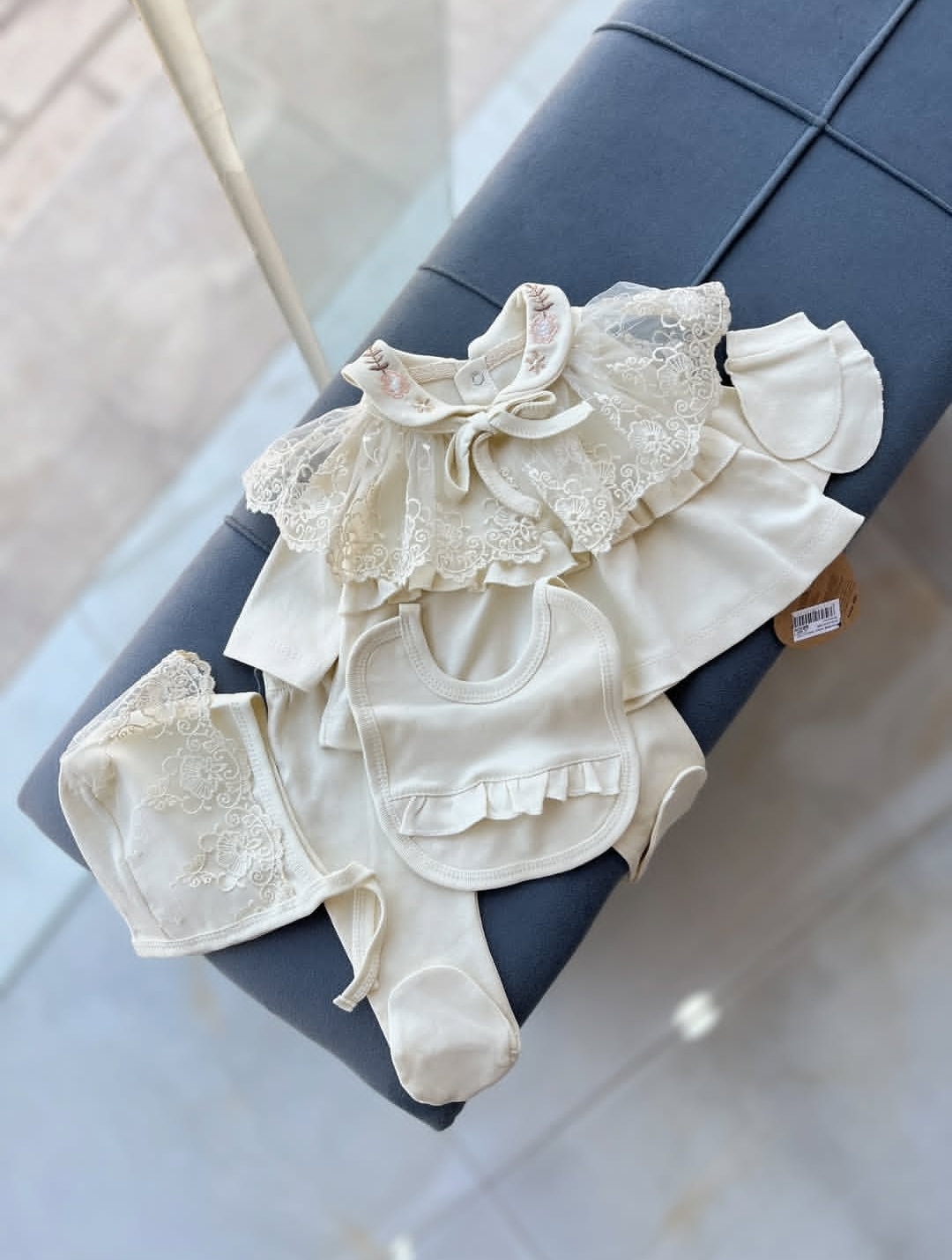 ست پنج تیکه لوکس نوزادی شامل بلوز شلوار کلاه دستکش و