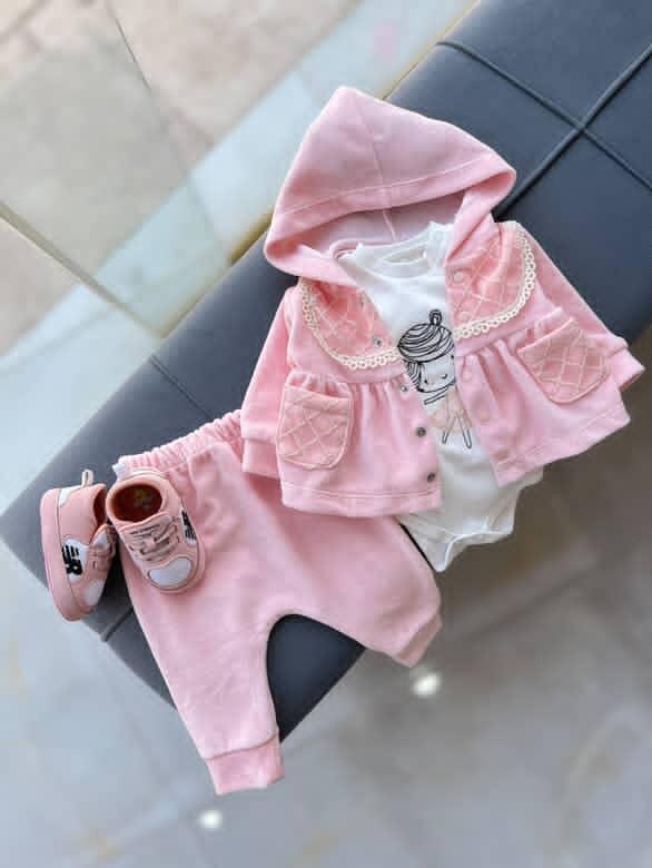 ست سه تیکه شامل بادی آستیندار صدرصد نخ پنبه نرم و لطیف و سویشرت کلاهدار مخمل و شلوار مخمل